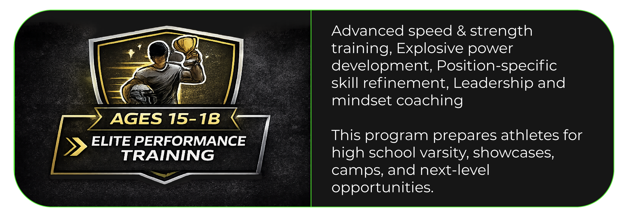 Elite Sports is a performance-driven training program designed to help young athletes build speed, strength, confidence, and discipline on and off the field. We work with athletes ages 4–18, meeting them where they are and helping them grow into the competitors they’re meant to be. From foundational movement to advanced position-specific training, our programs focus on proper technique, mental toughness, and long-term athletic development, not shortcuts.
